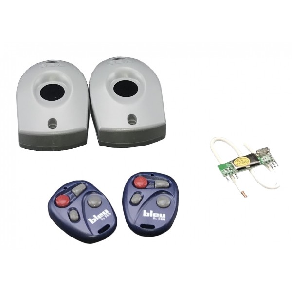 Kit para automatismo B-220, compuesto de receptor 433MHz, dos emisores ROUND y célula fotoeléctrica emisor-receptor.